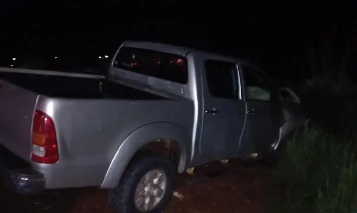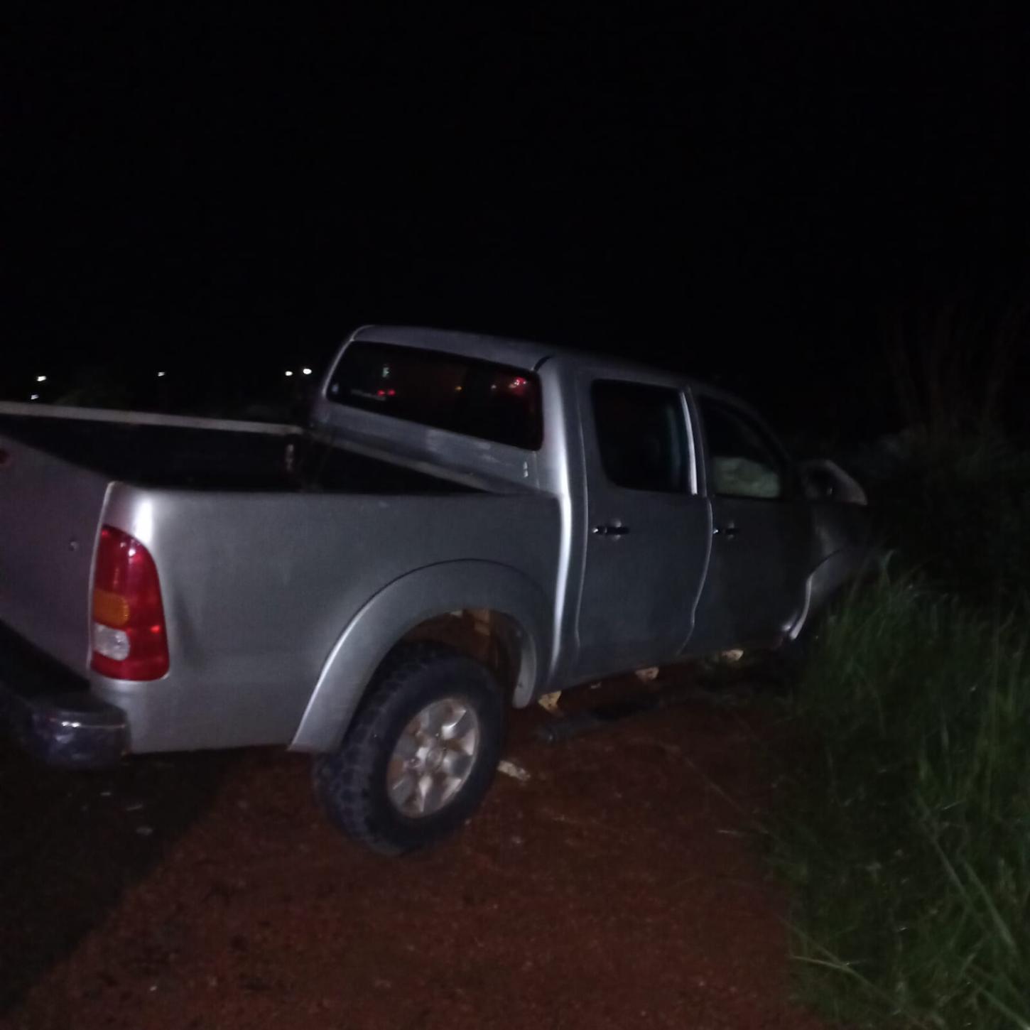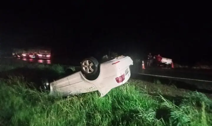 Ao chegar no local, verificamos o acidente no sentido sul, a presença de populares sinalizando o local e os dois veículos fora da pista de rolamento, sendo o VW Pollo no canteiro central com o teto ao solo com duas vítimas em decúbito dorsal fora do veículo e ao seu lado; e a Toyota Hillux no acostamento direito/mato com uma vítima sentada no interior que não estava presa às ferragens.